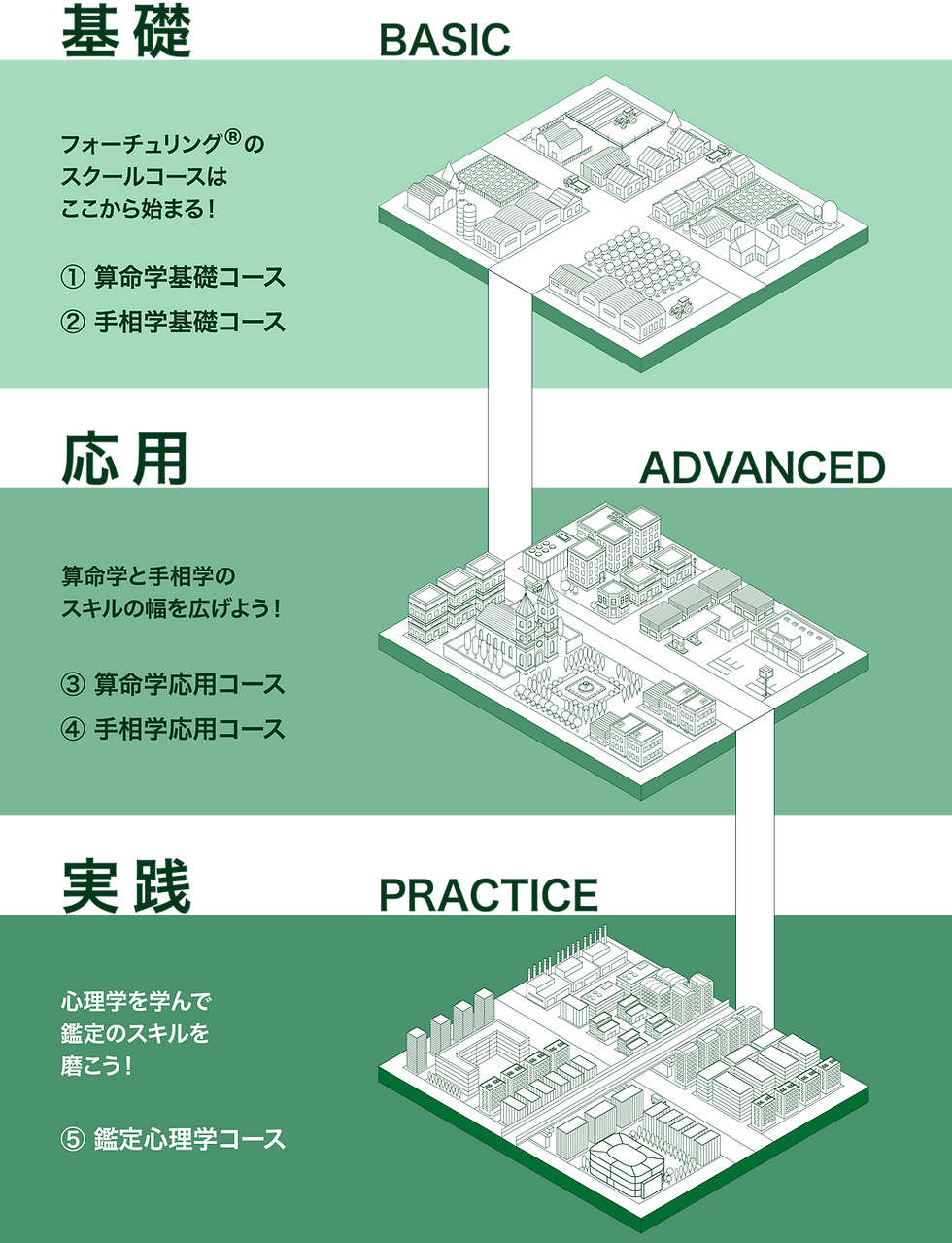 「フォーチュリング®︎カウンセラー」になるには、下の5つのコースをすべて修了することが必要です。
